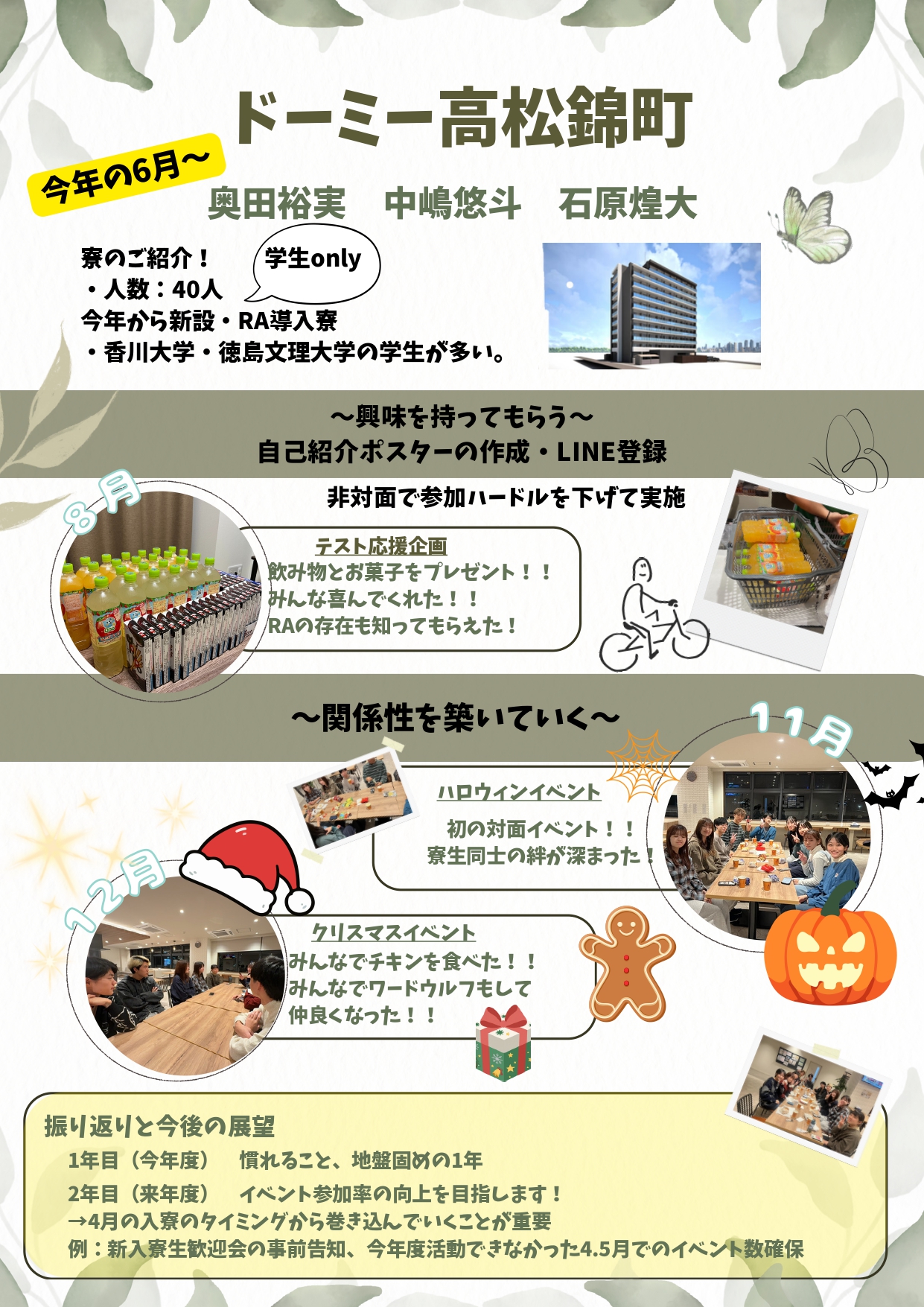 共立メンテナンスが全国の学生寮〈ドーミー〉で展開するResident Assistant(レジデント・アシスタント)プログラム。仲間を支え、より良い“暮らしと学び”をつくるために、日々のコミュニケーションやイベント企画を行い、寮のコミュニティを育みます。多様な経験を通じて自らも学び、成長していく――RAプログラムは、そんな「経験の場」です。
